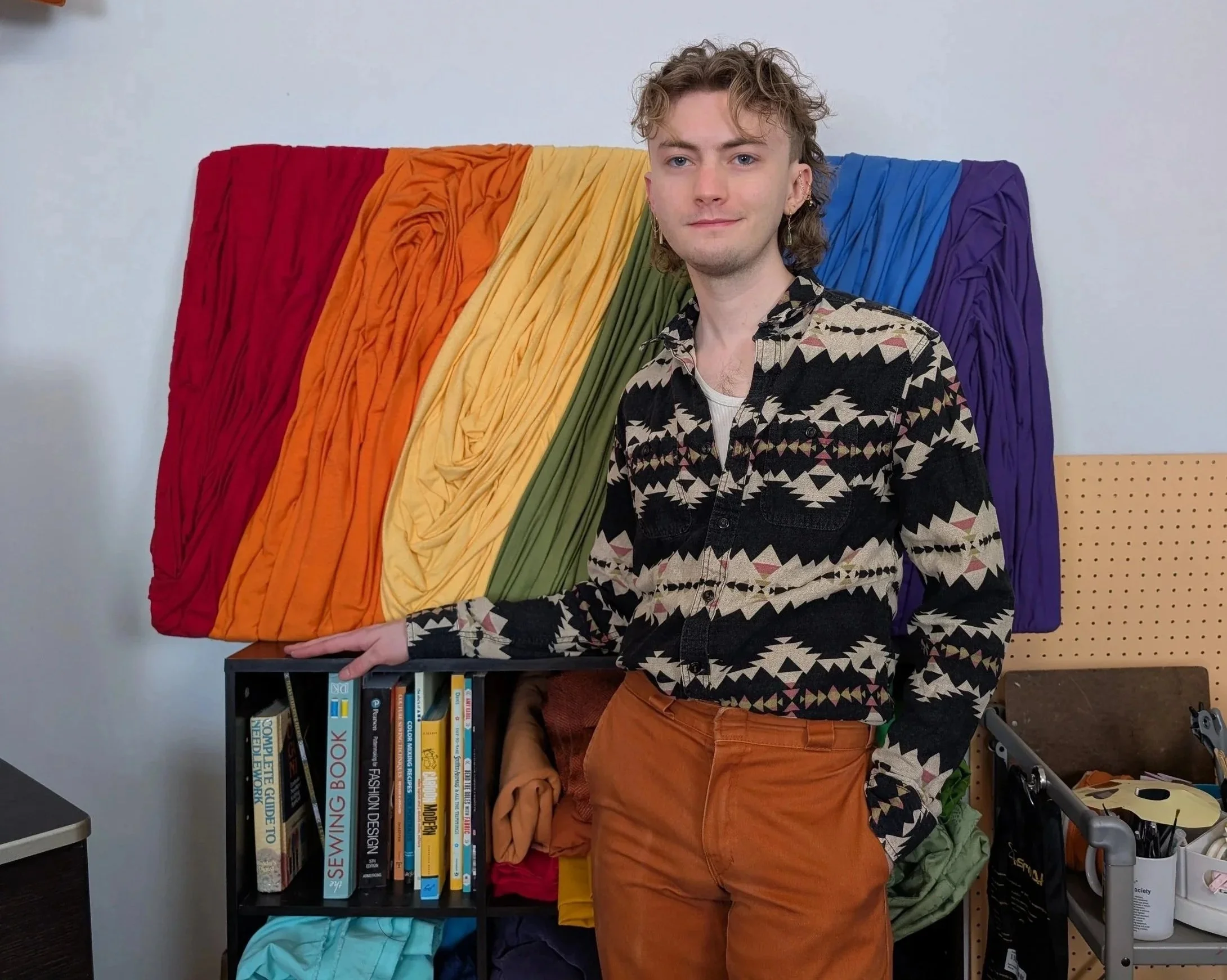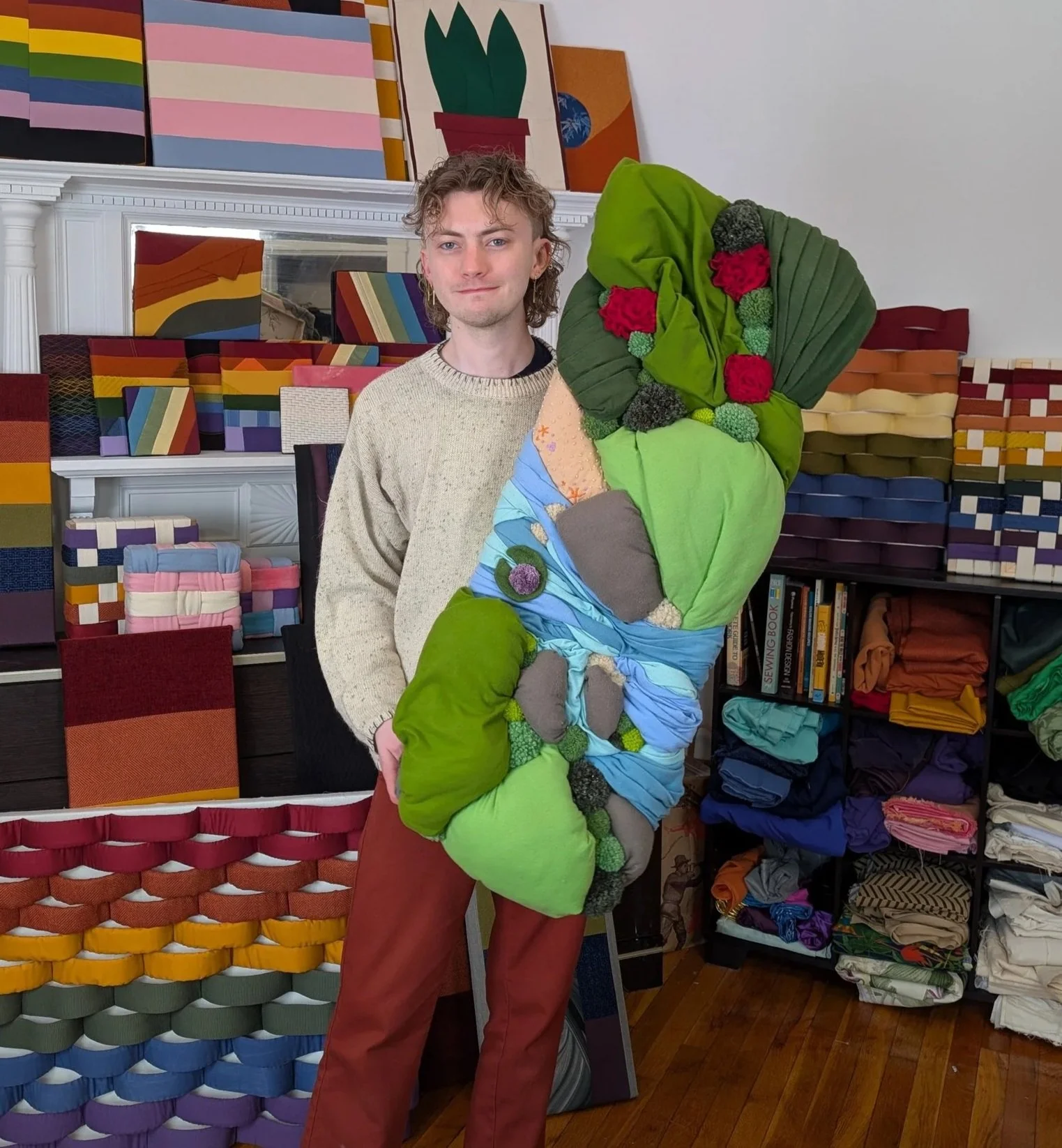 Hi!! My name is Jacob Keven and I’m a queer self taught artist living in the Boston area with my cat, Freya. In my creative practice I combine quilting, couture, and sculpture techniques to create art with an emphasis on texture and color. I strive to be mindful of waste and use reclaimed materials whenever possible. All of my work is made exclusively with secondhand fabric.